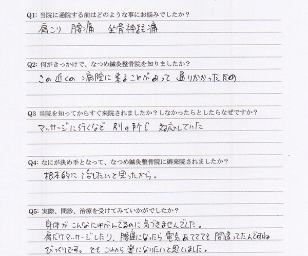 大変丁寧に聞いて頂き、適切と思われる施術をしていただきました。